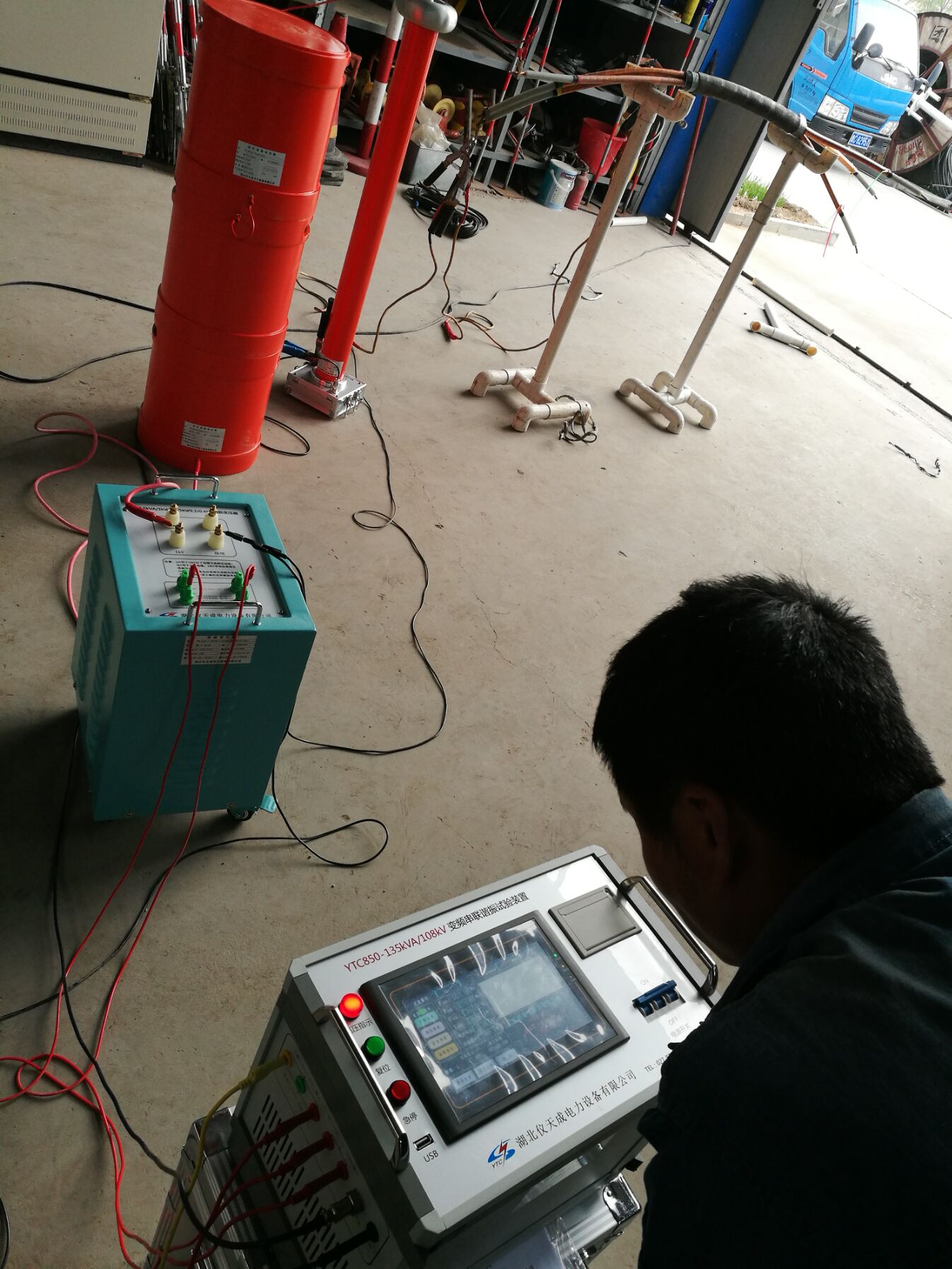 此次培訓的設備和內容很多。李工首先對各項設備的使用,接線方法進行了實地操作和詳細的講解,但此次培訓的重點是YTC850-135kVA/108kV變頻串聯諧振試驗裝置,該設備具有流、零位啟動、系統失諧(閃絡)等保護功能,過壓過流保護值可以根據用戶需要整定,試品閃絡時閃絡保護動作并能記下閃絡電壓值,以供試驗分析。整個裝置單件重量很輕,便于現場使用。裝置具有三種工作模式:全自動模式、手動模式、自動調諧手動升壓模式,方便用戶根據現場情況靈活選擇,提高試驗速度。